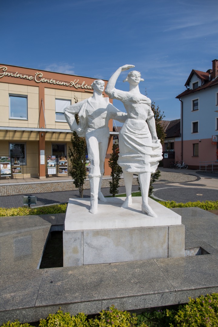 Pomnik Karolinki i Karlika w Gogolinie to symbol miasta oraz jeden z najbardziej rozpoznawalnych monumentów na Opolszczyźnie. Rzeźba nawiązuje do znanej śląskiej pieśni ludowej „Poszła Karolinka do Gogolina”, która stała się nieoficjalnym hymnem regionu. Pomnik przedstawia Karolinkę – młodą kobietę kroczącą z wdziękiem i pogodą ducha – oraz podążającego za nią Karlika. Postacie wykonane zostały z cementu i grysu marmurowego, a ich autorem jest artysta Tadeusz Wencel. Uroczyste odsłonięcie pomnika miało miejsce w 1967 roku, w dniu nadania Gogolinowi praw miejskich. Monument od razu stał się znakiem rozpoznawczym miejscowości i do dziś jest jej ważnym punktem tożsamości kulturowej. Od 1987 roku wizerunek Karolinki i Karlika znajduje się również w herbie miasta, podkreślając jego związki z tradycją i folklorem. Pomnik usytuowany jest w centralnej części Gogolina, w miejscu dobrze widocznym zarówno dla przejeżdżających, jak i podróżnych odwiedzających miasto pociągiem. Wokół monumentu często odbywają się uroczystości, koncerty i wydarzenia kulturalne, a sama pieśń o Karolince i Karliku niezmiennie towarzyszy lokalnym świętom. Obecny napis na tablicy pomnika to cytat z Goethego: „Gdzie słyszysz śpiew – tam wchodź, tam dobre serca mają…”, co dodaje temu miejscu szczególnego, humanistycznego charakteru. Pomnik Karolinki i Karlika to nie tylko ozdoba miasta, ale przede wszystkim trwały symbol śląskiej tradycji, miłości i przywiązania do rodzinnych stron.